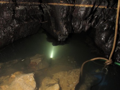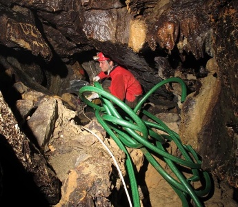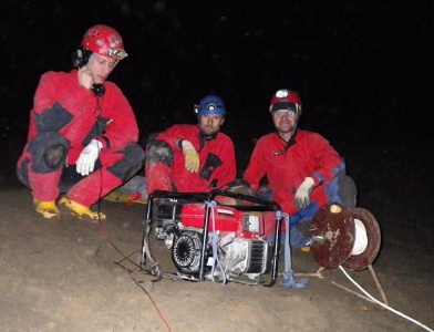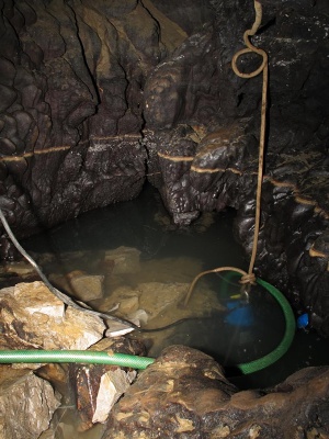 K našemu příjemnému překvapení začala hladina vody v sifonu klesat. A hladina v komoře, kam se čerpalo, začala stoupat. Po vyčerpaných 20 - 30 cm se pokles zastavil, zjevně hladina vody v komoře dosáhla stavu, kdy přepadává systémem puklin do našeho sifonu. Naštěstí se nám podařilo objevit puklinu, která směřuje odtok někam jinam a tak jsme mohli pokračovat. Hladina klesla o cca 0,5 m, jenže potom ... centrála začala vynechávat a již se nám ji nepodařilo zprovoznit. Podotýkám, že šlo o 2kW Hondu, se kterou jeskyňáři z Liberce běžně čerpají v kuse několik hodin.