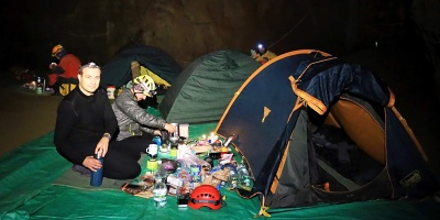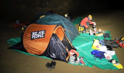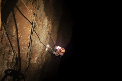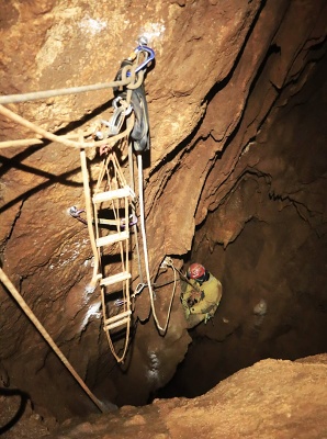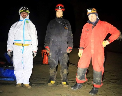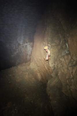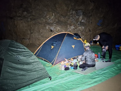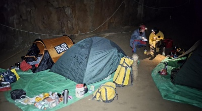 a Pavel s Klavídem vystrojili propast. Materiálu na lezení a kopání bylo vcelku dost, proto jsme ho raději spustili na čtyřikrát. Jakmile jsme se ponořili do jeskynní tmy, začal čas plynout hrozně rychle. Během pátku jsme stihli zřídit bivak v dómu Fotbalový plac známému nyní spíše pod názvem U kosmíčů. Tento nultý bivak je sice krásně blízko vchodu, ale je zde silný skap a relativně nízká teplota, cca 7 stupňů. Z tohoto důvodu je výhodné postavit pro bivakování stany.