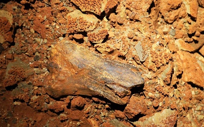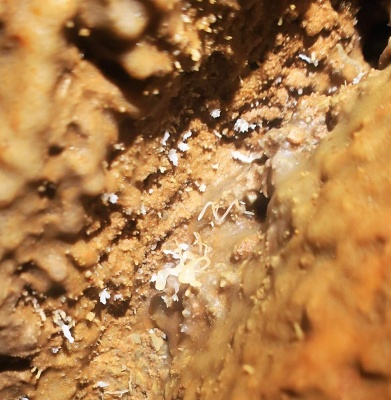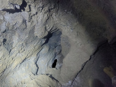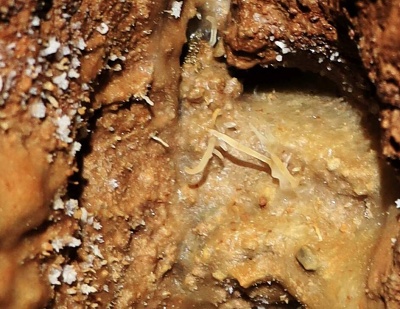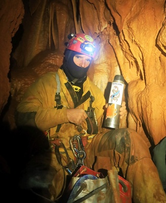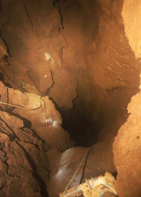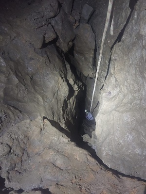 V sobotu ráno jsme vstali v 8 a začali chystat věci na lezení komína a kopání. Do komína se vydal Pavel s Klavídem. Čekalo je náročné tříhodinové lezení nahoru s veškerým materiálem a v horních partiích potom lezení vrcholové části komína. Vyzdobená roura šířky 5 x 2 m skýtala úkryt v boční vyzdobené jeskyňce, kde měl Klavído jistící štand a Pavel mířil do výšin. Vylezl téměř 30 m vysoko do neuvěřitelné celkové výšky 144 m nad patu komína!!! Až pod zasucený široký vrchol, kde mezi kameny z opadu ze závalu našel kost prastarého zvířete. Pracovně ji identifikoval jako kost nosorožce, ale je možné, že to byl původní slovinský druh zdatného jeskynního koně (tzv. bílého opičího lipicána), specializujícího se na lezení komínů😊 V jedné z puklin našel Pavel krásná drobná excentrika.