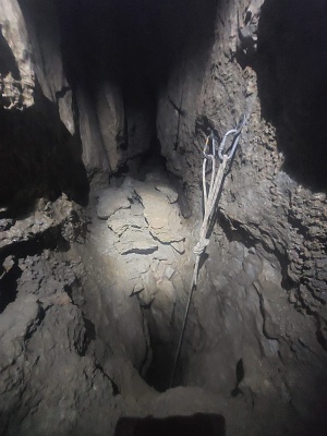 A co jsme mezitím dělali my ostatní? Šli jsme zapnout kopení pod Vstupní propast. Zrovna když jsme přicházeli do prostory ozářené kuželem denního světla, stál na balkónku Pavel Chaloupský. Slanil za nama a začal tahat z batohu svoje cajky. Foťák a akumulátory do vrtačky. Jirka Feix vystrojil Propástku u kola a slanil dolů.