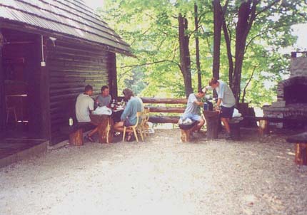 Po pár minutách jsme byli seznámeni s tím, že lesní cesta je hojně využívána zdejšími automobilisty jako výborná zkratka k návratu z hospody. Po raním probuzení vysekáváme zmrzlého Jindru ze spacáku a zanedlouho již míříme do Laze, vesničky na ostrůvku uprostřed dlouhého polje. Toto je na jaře zaplavováno a následně odvodňováno studnami, které nechal vylámat ve skále do trativodů moravský rodák William Putik.Míjíme klasickou vesnickou "palušu" a blížíme se k výše položenému jeskyňářskému kempu (www.speleocamp.com). Vítají nás rozvěšené overaly a helmy belgických kolegů. Ano, tady jsme doma! S majitelem kempu, Francim (Franc Facija franc.facija@siol.net), jsme prostřednictvím e-mailu koordinovali naši návštěvu. Stavíme stany do stínu stromů a vyrážíme do první jeskyně - Mačkovice. Našim průvodcem nám byla malá knížka od Iana Bishopa, která popisuje většinu jeskyní klasického krasu Slovinska, včetně mapek a lokalizací. Nápadný, prostorný vchod do Mačkovice leží asi 100 metrů za vesnicí. Jeskyně má délku 620 metrů, je poměrně prostorná a končí, jako většina zdejších jeskyní, v hlinitých profilech nebo sifony. Po dvou hodinách vycházíme zpět na povrch, jdeme se osprchovat a plánovat další akční dny.