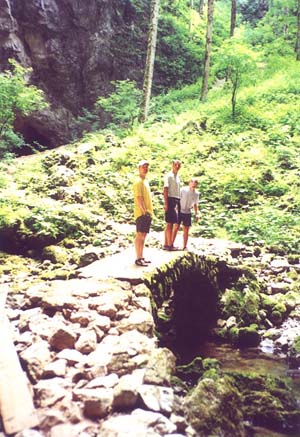 Na úterý nám Franci domluvil průvodce do největší vyvěračky v okolí - Planinské jamy. Tato 6156 metrů dlouhá vodní jeskyně je přístupná pouze s průvodcem. Vstup nás stál se slevou 20 000 Sit / 7 osob. Průvodce nám mohutné prostory osvětloval svým 20 watovým halogenem, bez něhož bychom nic z jeskyně neviděli, i když po pár stech metrech obrovských prostor lemovaných starou vojenskou cestou nám to připadalo trochu stereotypní. Přece jenom nejsme vodáci, abychom stále jenom pádlovali ve tmě. Na závěr jsme navštívili část zvanou Paradiž (ráj). Konec této vyzdobené chodby končil hlinitým sedimentem. Ani zde nebyly patrny žádné stopy po výkopových pracích. Jeskyně byla poměrně dobře zabezpečena vzhledem k unikátní krápníkové výzdobě. Ve středu část naší expedice odjela opět do "Julek" a my z "SRT" teamu jsme šli hledat vchod do jeskyně Najdene. Po dvou hodinách bloudění po lese jsme přece jenom našli v zemi malý otvor. Tato 5 km dlouhá jeskyně by se rozměrově dala srovnat s Amatérskou jeskyní v Moravském Krasu, ale byla, tak jako Gradišnica (leží v jejím pokračování), zahalena do blátivého závoje. Nezvykle často jsme zde nacházeli stopy po vypáleném karbidu. Také v této jeskyni je mnoho neprozkoumaných komínů a sifonů. Po této návštěvě jsme měli jeskyní už trochu dost a začali jsme uvažovat o cestě k moři. Ve čtvrtek ráno balíme a odjíždíme k pobřeží na Istriji. Cestou se zastavujeme v Postojne jame. Udivuje nás tunel pro vláček vyražený v těle mohutného krápníku.U moře pak dopíjíme zásobu "plecháčků" a testujeme naše čluny v mořských vlnách při návštěvách našich kluků Robinsonů, co nechtěli spát se "špekáčkama" v kempu.V neděli se šťastně vracíme domů a vzpomínáme na všechny ty úžasný díry, co skrývá Slovinsko - země nám tak blízká a přátelská! Bohužel z této expedice se díky zničenému filmu nedochovala žádná fotka z jeskyní, proto jsou zde fotky pouze z povrchových akcí. |