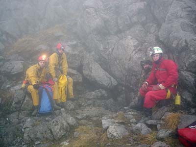 V sobotu ráno byla opět mlha a foukal vítr. Hned v 7 hodin jsme všichni udělali rojnici v rozestupech na dohled od sebe a ve výšce tábora jsme začali precizně prohledávat planinu. Naštěstí se nám daří vchod brzy najít. Je situován opravdu ve výšce tábora, což znamenalo, že jsme nenašli to správné tábořiště nacházející se níže pod vchodem. Okamžitě zahajujeme přípravy na sestup. První skupina vaří a chystá se do jeskyně, druhá skupina jim balí speleovaky. Náhradní plán je takový, že první skupina začne vystrojovat, až kam to půjde, ale po 6 hodinách zahájí výstup zpět. Druhá skupina vstoupí do jeskyně 5 hodin po nich a vše odstrojí. Nejpozději v 1 hodinu ráno by jsme měli být všichni venku, aby jsme si stačili ještě odpočinout, sbalit tábor, sejít do doliny a odjet domů.