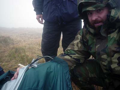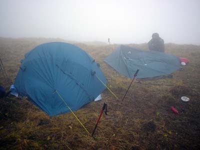 První skupina ve složení U, Sebo, Bradek a Libor zalézá v 11 hodin. Mají ssebou 600 metrů lan a majlonky, protože celá jeskyně je osazena nerezovými Batinoxy. Stále přetrvává mlha, vítr zesiluje a v nárazech má určitě přes 120 km/h. Když se druhá skupina vrací zpět do tábora, zjišťuje, že dva ze tří stanů se vlivem větru zbortily. Dvouprutá konstrukce Hannahu nevydržela až tak, že rozštípané laminátové pruty čněly skrze tropiko ven. Naše stanové vybavení nabylo úplně ideální. Navíc kvůli časové tísni druhá skupina musela zalézt do jeskyně dříve, než by první skupina vylezla a tábor by byl nějaký čas bez dozoru. Naznali jsme, že vzhledem k tak hroznému počasí nemůžeme tábor opustit. Ale také nemůžeme oslabit druhou skupinu o sílu, která by mohla chybět při odstrojování jeskyně. Rozhodli jsme se proto akci ukončit. Proto se P se Zdenálem rychle oblékají a mizí ve vchodu s cílem co nejrychleji zastavit vystrojovací skupinu.