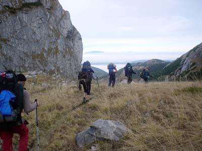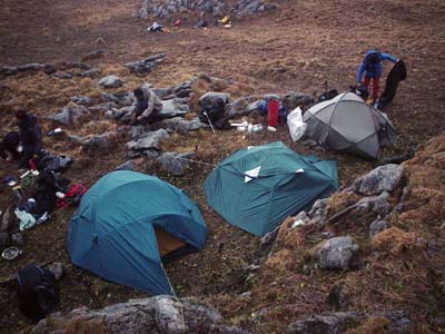 V pátek v 9 hodin jsme už nedočkavě stáli na začátku doliny Malé Laki. Auta jsme nechali zaparkované na dvoře chalupy a pozvolna jsme začali stoupat s veškerým materiálem vzhůru. Byl slunný den, ale vrcholy hor halily černá oblaka. Nahoře foukal silný vítr a pomalu nás zahalila mlha. V 15 hodin jsme už stáli na rovném plácku, kde jsme si mysleli, že jsme stanovali minule. Nejprve jsme postavili stany. První skupina vařila a připravovala se na noční vstup do jeskyně. Druhá skupina se mezitím snažila najít v mlze vchod. Po bezúspěšné hodině hledání jsme se sešli opět v táboře. Začínalo se pomalu stmívat. Znovu jsme se vydali do terénu prozkoumat další část planiny a zkalibrovat výškoměry výstupem na hřeben. Pomalu nás pohltila tma. Další hledání ve tmě a v mlze bylo už téměř nebezpečné, takže jsme v táboře udelali další válečnou poradu. Čas nás už začal dramaticky tlačit. Z výškoměrů vyplývalo, že náš tábor se nechází zhruba ve výšce vchodu, a že jsme tedy prohledávali terén příliš vysoko. Rozhodli jsme se tedy jít spát a brzo ráno zkusit vchod najít ještě jednou. Noc byla bezesná, hlavou se honilo příliš mnoho myšlenek, silný vítr znovu a znovu cloumal našimi stany.