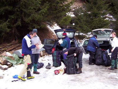 Když jsme se všichni sešli v Malužiné, zhodnotili jsme cestu, teplotu, kořalky a pivo, a po poměrně krátké, avšak dostatečně bujaré debatě ve stanu jdeme spát. Ráno se budíme do počasí, které se odborně nazývá „šedo“. Sluníčko je schované za souvislou hradbou mraků, a tak nebyla v noci ani zima. Sbalíme stany, a jdeme na tradiční snídani do místní restaurace. Výrazně silnější a probuzenější pak dobalujeme batohy venku před auty. Rozdělil se společný materiál (lana, mailony, kovárna…) a někteří přehnaně aktivní neváhají využít čas ke studiu expediční literatury.