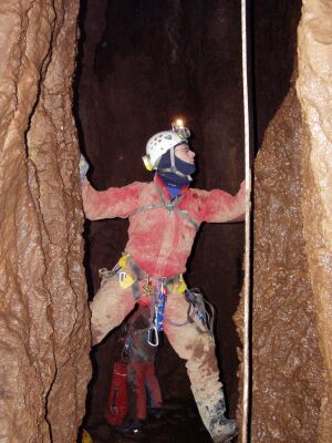 Po jejím slanění následoval krátký komínek s napevno nainstalovaným žebřem a pak propástka dolů, taktéž se starým kovovým žebřem. Odtud jsme slanili zbývajících 30 metrů do starého bivaku (-190m) kde naše exkurze končila. Další pokračování již bylo bahnité a úzké. Cestu nahoru jsme zvládli celkem v pohodě až na úzké místo, kde si Jarda trochu zabojoval. Po dosažení povrchu nás přivítala armáda komárů, kteří nás tak doštípali, že Komáří louka je proti tomu laláč.