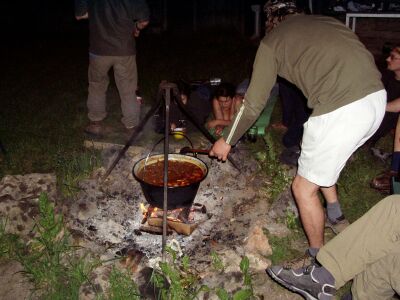 Po návratu na základnu nás čekalo překvapení. Maďaři začali připravovat pravý guláš. Přijela dokonce i maminka všech jeskyňářů a večer se vrátilo i družstvo z Vecsembükku a Jablečné. Kluci toho měli docela plný brejle. Trochu jsme popili, pojedli výborného guláše a šli unavení spát.
