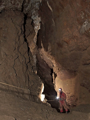 Liezť začínajú v JV časti dómu, na vrchole suťového kužeľu. Prvú časť lezie Sebo, ktorý voľným lezením, dolieza do výšky asi 12m. Tu zriaďuje štand. Túto časť komína tvorí kolmá puklina a sklonená skalná rímsa, ktorá stúpa smerom na východ. Rímsa je široká 20-70cm a hlavne v hornej časti je silno rozrušená. Na istenie bolo použité prirodzené istenie a istenie zanechané lezcami zo 70tich rokov. V lezení potom pokračuje Bradek, ktorý opäť voľným lezením traverzuje asi 3m doľava, nasleduje totálne rozchrastaný 3,5m vysoký skalný stupeň, na vrchole ktorého nachádza starý štand. Ďalej pokračuje 20cm širokou horizontálnou skalnou rímsou v kolmej stene. Po asi 4 metroch musí zliezť na nižšie položenú rímsu. Touto sa dostáva do východnému rohu dómu a tu dolieza do vrcholového dómu, asi 18m nad vrcholom svahu v Dóme Brekcií. Po rekognoskácii dómu, obaja zisťujú, že pokračovanie nie je možné. Dóm má rozmery 8x6x6m.(d*š*v) Dno dómu smerom na severovýchod stúpa a je pokryté suchým hlinitým sedimentom. Vo východnej časti dómu sa nachádza stúpajúca chodba dĺžky asi 6m, ktorá sa postupne zužuje a končí neprielezne. Dno je pokryté sedimentami, na ktorých je vyrastených viacero stalagmitov čisto bielej farby, výšky do 30cm. Zo stropu rastie veľké množstvo brčiek.