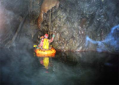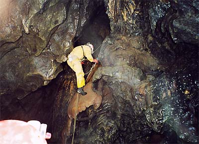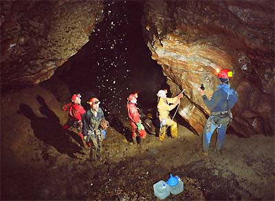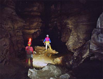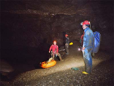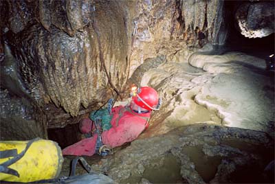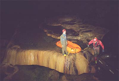 Dole již Jindra, Jarda a Bradek začali kontrolovat telefonní vedení. Já s Džerym transportujeme obrovský speláč s komplet velkým člunem. Docela lahůdka. Ještě, že jsme plni sil. V prvním bivaku úspěšně zapojujeme telefon a pokračujeme do dalších akčních pasáží, kde musíme akrobaticky překonávat gamesky rozličných podob. U malého traverzu přes jezírko potkáváme trojici exkurzistů, kteří jsou plni dojmů z Kačne jamy. Pokračujeme do Písečného dómu, kde se nachází zásadní křižovatka. Dóm se svažuje k Ogabnu jezeru, které jsme loni přeplavali do nové části jeskyně, která byla objevena v devadesátých letech minulého století. Do části, která byla objevena v sedmdesátých letech se jde cestou vlevo. Nainstalovali jsme sem nový zelený kabel. Následuje krkolomná cesta s traverzy přes sintrové kupy, mezi nimiž se nachází nehluboká, leč ne zas až moc mělká, jezírka. Jsou zde natažena stará fixní lana a my jim věříme. Po chvíli dorážíme do druhého bivaku poblíž propasti Saturn. Jarda lokalizuje pokračování skrz zával do ústí propasti. Jindra za psychické podpory FanTomáše pokračuje ve vystrojování Saturnu. Ostatní posíláme zpět k východu.