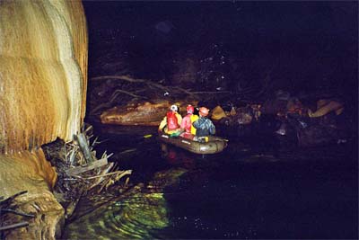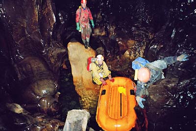 Slaňujeme podél krápníků ze který crčí voda až na mezipatro s jezerem a z něho až do Spodní chodby, která vypadá dosti nevábně. Všude se válí hromady dřevěné hmoty, je tu spousta naplavených sedimentů a ze stěn občas vyvěrá načervenalý potůček. No zkrátka rychle hledáme pokračování k Řece. Nějak instinktivně pokračujeme chodbou dolů a shledáváme ji na konci uzavřenou jezerem. Spekulujeme, zdali je tolik vody, aby byla hladina tak vysoko, že ani neslyšíme řeku. Nakonec se rozhodujeme prozkoumat i zdánlivě stoupající chodbu, kde po pár desítkách metrů přicházíme již k místu, které popisovali borci po minulé návštěvě Kačne jamy a slyšíme hukot vody. Učinili jsme rozhodnutí, že má smysl podniknout velkou výpravu k Řece a pokusit se jí překonat. Otáčíme. V bivaku ještě doplňujeme energii a smažíme ke vstupní šachtě. Bez báglu jdou gamesky jaksi rychleji. Po příchodu pod šachtu zjišťujeme, že jsme zbytečně spěchali. Na první přepínce visí zaseklý Jarda a nadává. Snažíme se ho uklidnit a postupně se dobrat k tomu, s čím se trápí. Nakonec se mu problém nějak podařilo zvládnout a valí bez dalších problémů nahoru. My s Jindrou jsme si zatím prohlédli nádherně vyzdobenou Západní chodbu. Po výlezu nahoru jsme byli někteří již osprchovaní, takže jsme ani další koupel nepotřebovali. Dorazili jsme do tábora kolem půlnoci, kde se zrovna chýlila do půlky velkolepá slovinská oslava. Potkali jsme se Peťou Polákem a Peťou Němcem, kteří dorazili ve vypůjčeném autě a vylíčili jsme jim situaci. Zanedlouho se borci společně s Plzeňákama odebrali do spacáků a my jsme mohli roztočit rutiku se Slovinci. Plánivy jsme reprezentovali celkem dobře. Vyhráli jsme jednu soutěž v obíhání kůlů a dopili jsme zásoby piva. Ani si nevzpomínám proč mě ráno mírně bolela hlava.