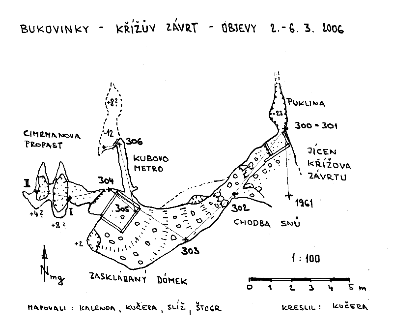 Zásadního objevného postupu se podařilo dosáhnout v Křížově závrtu během pracovní akce od středy 1. do neděle 5.3. Ve čtvrtek dopoledne se podařil první 15 m průnik do dómku 6x7 m chodbou výšky 2 m a sklonu 45°. Práce dále pokračovaly hloubením šachtice v sz. části dómku. V sobotu bylo dosaženo úzkého trativodu, který musel být rozšířen pomocí patronek (poděkování patří Kubovi ze ZO 6-16). Za tímto trativodem byla objevena asi největší prostora - propast o průměru 2 m s hlinitým dnem a dosahující do celkové hloubky asi 40 m pod povrchem. V těchto prostorách je ještě další komín s neprůlezným oknem do další propasti. Více informací včetně mapy a objevitelských fotografií zde zveřejníme v závěru týdne.
