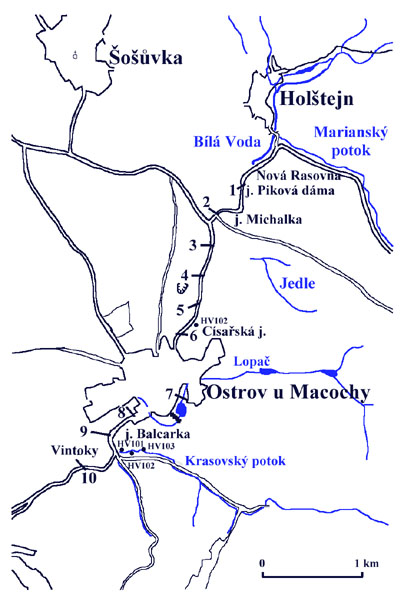 Profily sond VES byly voleny kolmo na údolí s krokem cca 0,5 km v místech, která nejsou ovlivněna lokálními závrtky od Wankelova závrtu těsně nad závěrovou hranou Holštejnského údolí sensus stricto jižně od Holštejna (říční kilometr Punkvy přes Suchý žleb14,48 km), přes Ostrov u Macochy až pod ústí Krasovského potoka jižně od Vintok (říční kilometr 10,41 km) (viz obr.1). Sondy VES byly umístěny na profilu s hustotou 5 – 10 m. Pouze na okrajích profilů byly umístěny doplňkové sondy VES 20 m od předchozích sond. Tímto způsobem bylo proměřeno celkem 10 profilů, na kterých bylo celkem 78 sond VES. Protože nebylo možno umísťovat proudové elektrody mimo údolí ve svazích (časté vápencové skalky), zvolili jsme tříelektrodové uspořádání se čtvrtou proudovou elektrodou v nekonečnu, což z praktických důvodů bylo cca 200 – 300 m od profilu v některém ze závrtků v údolí, kolmo na měřený profil.