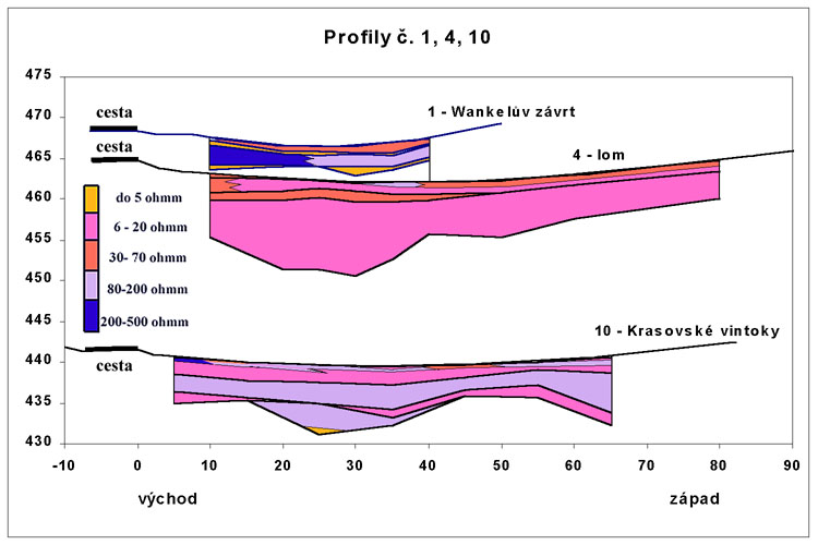 Nejmělčím (max. hloubka 4 m) byl shledán profil č.1 u Wankelova závrtu (viz obr. 3), který je zároveň dosti atypický svými vyššími odpory. Mezi vysokoodporovými vrstvami pravděpodobně suchých hlín nebo hlinitých štěrků se nachází velice nízkoodporová vrstva pravděpodobně jílů. Na kontaktu s vápenci, což je typické, je opět nízkoodporová vrstva.