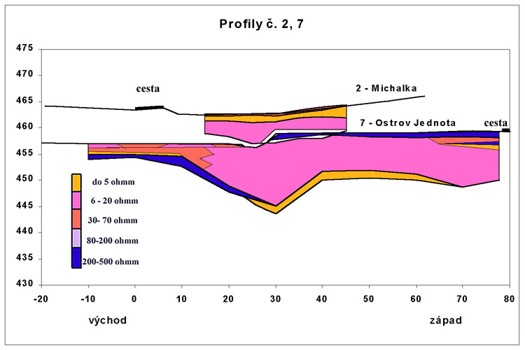 Profil č.7 procházel nad kontaktem vápenců a břidlic, který byl situován téměř pod strouhou, která dnes přivádí vodu Lopače do rybníka v Ostrově. Pod navážkou u prodejny Jednoty byla v hloubce cca 9 m zjištěna terasa, pokrytá sedimenty s nízkými odpory (viz obr. 4). Pod touto terasou byly zjištěny nevodivé horniny (typicky vápence). První sonda, která v podloží sedimentů zastihla horniny s měrným odporem cca 100 - 500 ohmm, byla vzdálena 50 m od silnice, tedy přesně na hraně koryta potoka Lopače. Ostatní všechny sondy zastihly v podloží pouze tyto střední měrné odpory, charakteristické pro břidlice. Přestože geologicky vymapované rozhraní vápence - břidlice by se mělo nacházet cca 50 m západně od cesty před prodejnou Jednota (Dvořák 1997), přímo u cesty, 10 m od první sondy VES, byly nalezeny výchozy hlíznatých vápenců.