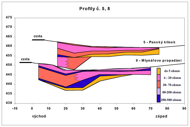 Profil č.5 u Panského klínku zastihl pravděpodobně v blízkosti cesty (15 a 25 m od okraje cesty) poruchovou zónu (viz obr. 6). Tato poruchová zóna je pravděpodobně totožná se zlomem, který byl vymapován Dvořákem (1997). Do hloubek cca 12 m se pravděpodobně nacházejí sedimenty, které je ovšem těžké odporově odlišit od podložních hornin s odpory cca 300 - 500 ohmm, které pokračují do hloubek větších než 100 m. Na základě měrných odporů je možno také interpretovat podloží jako břidlice, ale vzhledem k tomu, že vymapované geologické rozhraní břidlice - vápence se nachází cca 100 m východně od profilu (Dvořák 1997), není tato interpretace pravděpodobně správná. Od třetí sondy (35 m od okraje cesty) se situace zjednodušuje a pod sedimenty se nacházejí nevodivé vápence v hloubkách cca 4,5 - 5,5 m. Na konci profilu u jeskyně Panský klínek není pozorovatelné žádné snížení, které by naznačovalo možné proudění vody z údolí přímo do jeskyně, naopak hloubka dna se k západní část údolí pozvolna, ale neustále zvyšuje.