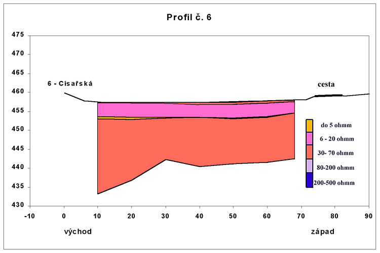 Profil č.6 u Císařské jeskyně je absolutně nejhlubším profilem, který byl ve žlebu proměřen (maximální hloubky dosahují až 25,5 m oproti maximálním hloubkám na ostatních profilech, které dosahují cca 12 m) a ukazuje na to, že v severně od Ostrova u Macochy existovala závěrová stěna poloslepého údolí nebo hluboký závrt, dnes vyplněný sedimenty (viz obr.7). Nad relativně homogenními sedimenty s měrnými odpory 15 - 33 ohmm v hloubkách od vápencového podkladu až cca 4 m pod povrch byla v celém profilu změřena nízkoodporová vrstva v hloubce cca 4 m (5 ohmm), která koresponduje výškově i odporově s obdobnými sedimentárními výplněmi na profilech 2, 5, 7, 8, 9 a 10.