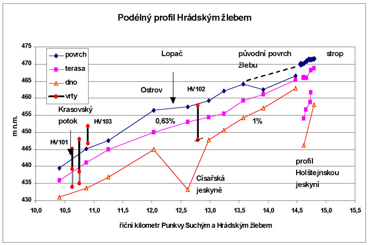Jak je vidět na obr. 8, strop Holštejnské jeskyně (Kalenda, Kučera 1999) i vysledovaná terasa v sedimentech plynule navazuje na povrch Hrádského žlebu a pohřbenou terasu ve žlebu, ale až od 3. profilu za závrtem č.37 jižně od křižovatky U kaštanu. Po druhý profil u jeskyně Michalka a závrt č. 37 je erodováno na obou profilech cca 3 – 4 m sedimentů. Současně nízké odpory v údolí na 2. profilu svědčí o blízkosti místa propadání vod do podzemí a zasedimentování závrtu případně závěrové stěny. Místem propadání vod mohl být závrt č. 37 nebo závrt 50 m severně od křižovatky U kaštanu.