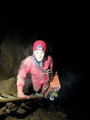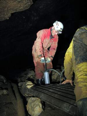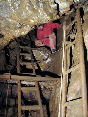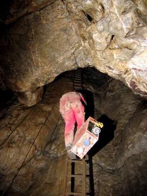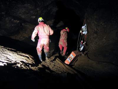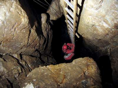 V pondělí vylezl Peťa Polák s Liborem onen správný komín nad hlavní vstupní puklinou hned za vstupní plazivkou do výšky cca 20metrů a s Petrem Nakládalem ho zaměřili na povrch. Dle měření vychází nejvyšší bod komína zhruba 20 metrů pod povrch. Nahoře v komíně si však všimli malého okýnka, kterým bylo vidět do sousední prostůrky rozměrů 4x2 metry s náznakem, že by mohla chodba pokračovat. Tomuto okýnku jsme se pak věnovali ještě na závěrečných dvou akcích s Uem a Sebem. Skoro to vypadalo, jako bychom se chtěli vyhnout úklidu čerpadel, kterému se věnoval zbytek skupiny, ale nahoře v komíně jsme si taky zkusili svoje. Inkriminované okýnko se nachází v sintrových nátecích co jsou na stěnách. A jak víme, tak sintr mikropatronkama nejde dobře střílet a tak jsme zvolili taktiku rozvrtávání aku vrtačkou a následným rozbíjením špicou a palicí. Bohužel i po dvou akcích z nichž první proběhla bez vrtání se ukázalo, že protesání otvoru do minimálně průlezného profilu nebude tak jednoduché. U pracovního místa se totiž prakticky nedá stát, jelikož se nachází na šikmé ploše pod vrcholem komína. Člověka tedy nebolí jen ruce od občasného bouchance palicí, ale i nohy ze stání v rozporu o stěny. Proto jsme taky z původní mocnosti odtesali jen asi jednu třetinu. Další akce již nebyla možná pro zatápějící se sifon bez čerpadel, takže toto místo s otazníkem zůstává prozatím nedořešeno. Dle množství sintru, které z této prostůrky vytékají lze předpokládat, že by se zde mohlo ještě jakési patýrko nacházet, ale také nemusí. Buď vše skončí za první zatáčkou sintrem v plném profilu, nebo závalem a nebo taky ne. To se dozví až Ti, kteří vhodí opět čerpadlo do sifonu a vylezou plni entuziazmu celý zablácení do Kalvárie. Lano jsme po akci z komína v Ostrém dómu stáhli, ale takový borci jako je Peťa Polák měli komín vysólovaný za půl hodiny, takže se o žádnou tragédii nejedná. Pro další nadšence doporučuji zavrtat těsně u okýnka nýt a s přijištěním se do něj posadit, aby se člověk neunavoval neustálým rozporem.