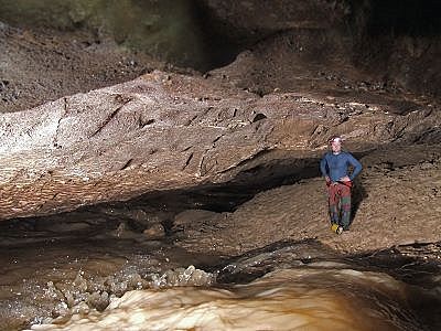 Po protečení vody jsme se všichni přesunuli na pracoviště do Trativodu v dómu U dvou velkých. Na čelbu šel Bradek a vzal to opravdu poctivě. Nejprve palicí upravil trasu ve skalní plazivce. Následně osadil kladku na spodní dráhu lanovky a pak definitivně zmizel s lopatkou v ruce v nejnižším místě. Kýble lítaly jak zběsilý. Nejprve se zdálo, že právě spodní lanovka bude značně brzdit odchod plných kýblů, ale díky tomu, že s námi šlo spoustu zdatných pomocníků, kterým za jejich pomoc patří velký dík, byla za chvíli vybroušena velice účinná taktika a celkem bylo vytěženo cca 150 kýblů. Během práce Bradek odhalil ústí úzké avšak volné skalní pukliny, ze které začal na pracoviště proudit čerstvý vzduch, takže oproti jiným velkým akcím, kdy jsme zpravidla pracoviště opouštěli pro nedostatek vzduchu, nynější akce proběhla v neskutečné vzduchové pohodě. Samozřejmě, že se nejednalo o žádný průvan, který by sfoukával žárovku čelovek, ale jistá cirkulace vzduchu byla nepochybná. Bradek na čelbě sledoval hlavně polohy naplavených štěrků a valounů. Tato taktika nás sice přivedla zpět pod hlavní propast, kde jsme pro ulehčení transportu nainstalovali 2m dlouhý žebřík, ale příště ho budeme muset nastavit o další dva metry a nějakým způsobem zabezpečit stále více nestabilní svah sedimentů, pod který je třeba se zahloubit. Na závěr mi dovolte poděkovat všem, kteří přišli naší skupině na tuto akci pomoct: Ze skupiny Myotis to byli: Jitka Hemzalová a Alda Havel a dále Viktor Kouřil a Martin Lobpreis. Za Plánivy se účastnili: FanTomáš, Jindra s Ivčou, Jarda, Luke a nový nadšený zájemce Luboš. ..a co se dělo v neděli?!... No a v neděli se k nám přidal Franci a společně jsme si za odměnu udělali exkurzi do Korálového závrtu. Korálový závrt se nachází v jihozápadním cípu Macošské plošiny, v těsné blízkosti skalní ostrožny Chobot. Byl otevíraný v roce 1940 Karlem Absolonem, spíš tedy jeho dělníky. Jeskyně není nijak rozsáhlá a velká. Tvoří ji tři patra a nejspodnějsí je v hloubce cca třicet metrů. Závrt je unikátní svojí krystalickou výzdobou. V dnešní době se v závrtu už nepracuje a je v konzervaci. Náš sestup byl poslední letošní. Jeskyně je chráněným zimovištěm netopýrů.