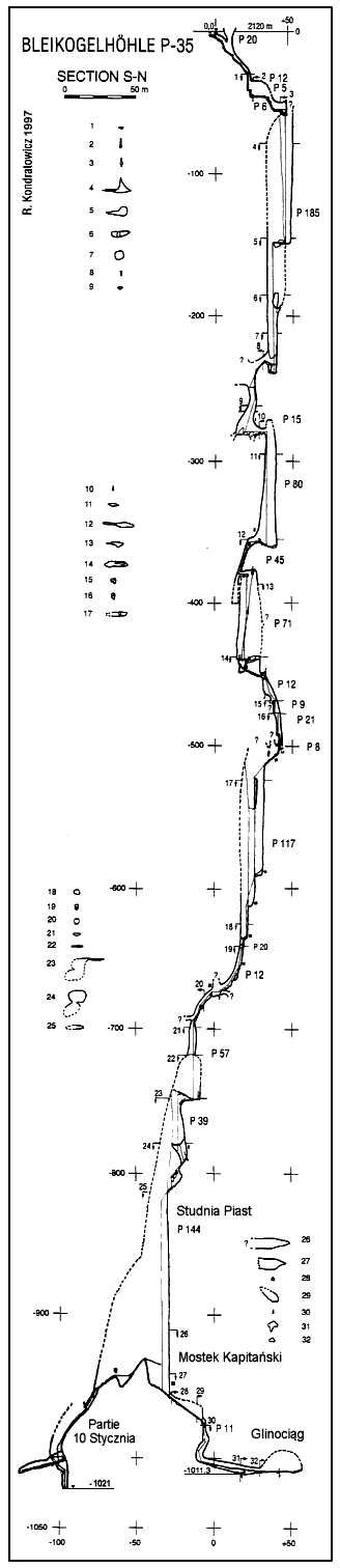 2. DEN: Probouzíme se do mlhavého rána. Autama vyjíždíme do 1000 m n.m. Tady na parkovišti rozdělujeme matroš a postupně se odhodláváme k brutálnímu výstupu na naši základnu - chatu Laufenerhutte ve výšce 1726 m n.m. Zdá se, že se vyčasí. Ve 14 hodin máme většinu materiálu vynešenou. Kluci z II. skupiny (Honza, Franci, Tomáš a Mates) jdou dolů pro zbytek materiálu. My z I. skupiny si dáváme voraz. Zítřek bude náročný. Pěkné počasí nám ale nedá spát a proto se vydáváme hledat vchod, který by měl být někde ve výšce 2120 m n.m. Během výstupu se začíná počasí zhoršovat. Kopce se halí do mraků. Za totální mlhy a naprosto intuitivně zkoušíme najít vchod. Prakticky okamžitě se nám jej daří najít a hledíme do úzké "popelnice" s nápisem P35!3. DEN: Ráno balíme matroš a sestavujeme taktický plán: vstupy do jeskyně budou následovat nezávisle na sobě vždy každých 24 hodin. I. skupina ve složení "P", "U", Milan, Beny a Majkl se vydává ke vchodu. Máme za úkol vystrojit první část propasti po studnu Věčných kurzantov v -520 m. Počasí je stále zoufalejší. Je mlha a začíná silně pršet. Jestli to tak půjde dál, nemáme šanci projít přes Mokré kaskády v -650 m. "U" vystrojuje první ohromnou magastudnu P185. Na jejím dně se loučíme s Majklem, který má problémy s ledvinami. S Uem pokračujeme dále užšími puklinami až do Sala Michaela v -280 m. "U" jde nahoru a nastupujeme s Milanem a Benym úzkým průlezem do další mohutné P80. Z jejího dna pokračujeme úzkou P45. V její polovině obočujeme horizontální úzkou puklinou, která nás zavádí do stropu P71. Toto místo se stalo klíčovým Benymu, který jím prostě neprošel. S Milanem se dostáváme k Bivaku v -450 m. Po malém občerstvení pokračujeme Suchými kaskádami ke skalnímu mostu další megaobrovské studny Věčných kurzantov P117. Zde nacháváme materiál a jdeme nahoru. Nevíme, jestli budeme moci skrze vodu pokračovat dále. Zdá se, že vody v jeskyni trochu ubývá. A je to pravda. Ve vchodě potkáváme Benyho. Hodinu bloudil ve tmě a v mlze po planině. Nenašel cestu na chatu. Venku je 30 cm čerstvého sněhu! Je půldruhé ráno. Celý promočení se rozhodujeme bivakovat. Značky pod sněhem bychom stejně nanašli. Po příšerně ztrávené noci se za úsvitu vydáváme na chatu, kde nás již netrpělivě očekávají kamarádi.