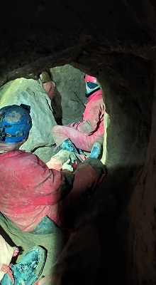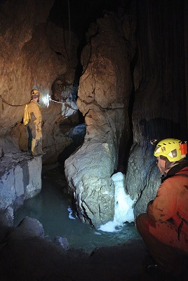 Další místo, které je rovněž limitováno, stavem vody na Přepadu, je chodba v Modrém komínu. Nachází se poměrně vysoko nad aktivním tokem a slibujeme si možný postup směrem k Plánivám v úrovni potenciálních středních pater. Bádaliště zatím nemá název a postupujeme nanejvýše opatrně s ohledem na krásnou krápníkovou výzdobu a její ochranu. Pokud nás voda pustí do komína potom se za směnu vykope asi jeden a půl až dva metry pod sintrovou deskou. Posledním místem, které je spíše občasné je tzv. Ostravská rozrážka nad Fousatým sifonem. V místě výrazné tektonické pukliny jsme překonali první užší místo a pracoviště se začíná zajímavě rozšiřovat. Přesto, toto tato puklina je prozatím jakousi náhradní variantou, pokud první dvě pracovní eventuality nejsou díky vodnímu toku přístupné. To se však letos stalo jen na počátku roku.