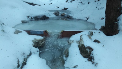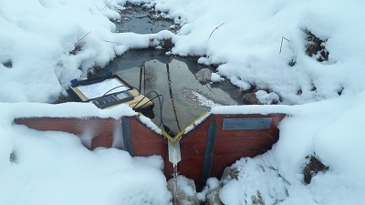 Další snímek ukazuje, jak vypadá idylické měření teploty a konduktivity na nádržce přelivu v Domínce. Konduktometr se dá umístit na led a ještě je místo pro ponoření sondy.