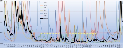 | Před nedávnem mě Bradek požádal, jestli není možné určit bezpečnou hladinu Bílé vody pro proplavání sifonů mezi Novou Rasovnou a Spirálkou, a dále, jestli se dá s předstihnem říct, kdy je pro tento cíl nejlepší období. Obě otázky pochopitelně souvisí s připravovaným Bělovodským Traversem o němž si toho ještě hodně přečtete na našich stránkách. No říkal jsem si, že ty odpovědi jsou poměrně jednoduché. Proto, aby mohl potapěč jít Říční chodbou, potřebuje průtok Bílé vody pod 250 litrů za vteřinu. To máme ověřené zkušenostmi. A období? No jasně, přeci na konci jara, někdy přelom května a června, než začnou bouřky, a potom září, na konci léta, když se počasí ustálí a je ještě relativně teplo. Přesto mi to nedalo a vzal jsem počítač a vynesl průtoky do roku 2019 až po celý rok 2024. Graf je trochu divoký a tak jsem udělal medián průtoků, který je jediný zvýrazněný. Čára oněch 250 litrů je ta vodorovná čárkovaná, červená. Ten medián potvrdil moje předpoklady - tedy ke konci jara a ke konci léta.