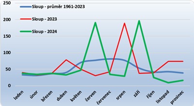 Jenže.... Jenže to není tak jednoduché jak to vypadá na tučné křivce mediánu. Ty tenké (omlouvám se za kvalitu grafu, ale líp to neumím), co jsou pro jednotlivé roky, totiž vesele nad tu tlustou vyskakují, a to jak se jim zachce. Zářným příkladem je rok 2024, ten loňský, který jakoby chtěl mé předpoklady rozmetat. Právě ve zmíněných obdobích si klidně Bílá voda spustí celkem slušné povodně (o nich už jsem psal v jiném článku). A tak jsem Bradkovi musel říct, že tohle jsou sice asi nejvhodnější období, ale nejlíp to budeme vědět jen tak 14 dnů dopředu, podle stavu a předpovědi počasí. A jestli to tak skutečně dopadne, o tom rozhodne můj jmenovec u nebeské brány... Asi tak, tak ještě jeden graf, jak to bylo se srážkama ve Sloupu v roce 2024. A mimochodem nechcete to zkusit teď? v době psaní tohoto článku teče jen 181 litrů... Pešťuk