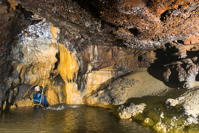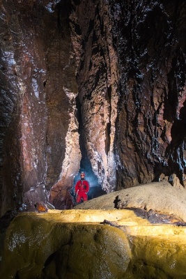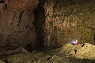 Já s Vítkem jsme dobu čekání na potápěče trávili prolézáním Hojkerjevy dvorany, kde jsme se snažili více či méně seznámit s místní spletitou sítí chodeb. Vzhledem k tomu, že Hojkerjeva dvorana leží částečně pod Kalvárií (gigantická horní zařícená prostora), je s podivem, že se v ní nesetkáváme s nějakým gigantickým závalem, jak je tomu v Lojzově podoru, ale v průniku těchto prostor se jedná spíše o obrovské rozpraskané bloky, mezi kterými se vytvořily průstupné chodbičky s často překvapujícím pokračováním – viz objev za Druhým sifonem. Podařilo se nám lokalizovat pár nadějných oken, ale nejzajímavější překvapení na nás čekalo v nejvzdálenější odtokové části dvorany. V puklinových chodbách nalevo od Prvního sifonu se nachází jak aktivní tok, který je přítokem do Prvního sifonu a je polohově na stejné úrovni, tak puklina s výrazným zdrojem studeného průvanu, která je výškově cca 20 m nad sifonem. Všechna místa byla dokonale zmapována Franciho mapovacím týmem již v létě roku 2012 avšak tehdy nebyl v této výrazné puklině zastižen žádný průvan. Povzbudivé na tom je to, že se puklina dá celkem jednoduše za jednu akci rozšířit a po cca 1 m je další pokračování již opět volně průstupné. Je vidět do vzdálenosti cca 5 m dopředu. Není však vyloučeno, že se zde po pár metrech nenarazí na zával. Puklina je evidentně odtoková, protože jsme zde našli menší klády přinesené proudem vody z Hojkerjevy dvorany. Tedy buďto se něco propláchlo, nebo byl zrovna otevřený nějaký polosifon a nebo je zde průvan jen v zimě....každopádně musíme příště toto místo určitě navštívit se střílením! Perspektivy objevu jsou dvě. Buď se může podařit najít cesta za odtokový sifon a tím pádem sledovat směr aktivního odtoku Reky a nebo se zde může najít zkratka do horní hlavní chodby Vzhodni rov, což by výrazně ulehčilo transport. Nechme se tedy překvapit. A co se vlastně dělo za Druhým sifonem? Roman, Jirka a Jan se nejprve přesunuli do koncových partií. Konkrétně do Dovjdómu Jiřího Macků, který důkladně domapovali a pořídili zde fotodokumentaci.