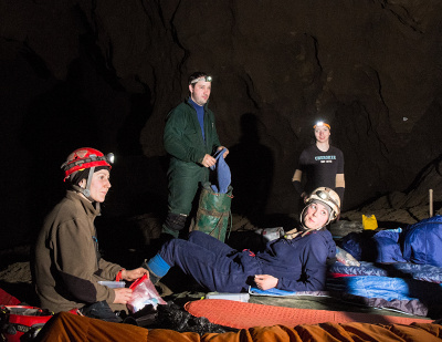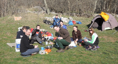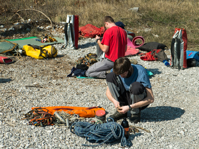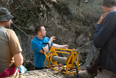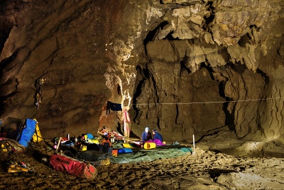 Poučení pro příště: lano v Kačne jamě vždy fixujte i v jeho spodní části. Jako náhradní lezení si pak v sobotu dali Lubin s Gasem jednu lezbu na galerii se směrem na Dvojdom, ale nic moc zajímavýho tam bohužel nenašli. Já jsem mezitím na povrchu strávil páteční slunné odpoledne návštěvou jedné propasti, kde jsme nainstalovali teplotní dataloger a provedli pozorování dvou velice blízkých částí jeskyně s velice rozdílnými teplotami. Teplejší místo s cca 12ti stupni se nachází v nejnižší části jeskyně, kde se jeskyně zužuje do fosilního vyschlého meadru s 5 m dlouhou koncovou úžinou a rohem do neznáma. Naopak aktivní dno propasti je evidentně za dešťů protékáno aktivním potokem, který transportuje hlinito písčité sedimenty přes úžinu do vedlejšího dómu. Dno další protory je pokryto opět sedimenty a vyspádované do nejnižšího místa s ohraničeným cca 3 až 4 m hlubokým propadem ve výrazném koutu dómu. Laickým pohledem to tu smrdí objevama, ale muselo by se to zadřevit. Do dómu proudí citelný studený průvan, který ale nejspíš mizí do nějakého dalšího okna v dómu. Takže je tu i možnost pro lezce. Po návratu na povrch jsme se vydali s Gáborem ještě do Vítkova dihalniku a taky jsme zde nainstalovali dataloger. Průvan jako vždy výrazný, vanoucí směrem ven. Poté jsme se s celým maďarským družstvem nachystali a v nočním hodinách jsme se vydali na sestup do Kačne jamy. Do bivaku jsme dorazili někdy po půlnoci. To však nevadilo a uspořádali jsme zde další mezinárodní večírek ve znamení pršutu a pálinek.