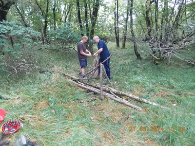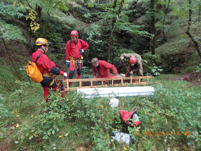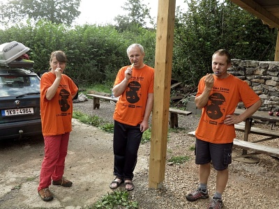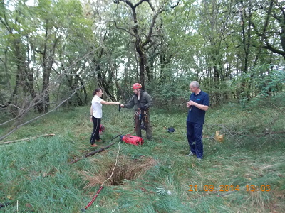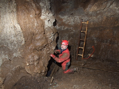 V sobotu dopoledne dost pršelo a tak nedočkaví maďaři pod Gáborovým vedením zalízali do Kačmy docela mokří. Mezitím dojeli i zbylí účastnící a tak nás z ČR bylo 6: já, Franci, Krb z Plániv, Vláďa a Valentina Priesolovi a bráška Míra Zoubek. Dolů do Podjunšky jsme nejprve spustili vytvořené dřevěné žebříky a pak dva trapézové plechy na pažení. Dolů jsme zalezli ve čtyřech. Osadili jsme dva teplotní datalogery. Značnou část času jsme věnovali instalaci výdřevy s trapézovým plechem a zbytek času jsme kopali. Ten zbytek času docela stačil, protože vzhledem k vydatným dešťům celého léta bylo spodní pracoviště vydatně protékáno vodou. Bylo zjištěno, že přitékající voda se na pracovišti nehromadí, ale odtéká do nízké chodbičky na čelbě, která byla odhalena při posledním kopání. Na pracovišti byl po celou dobu čerstvý vzduch a nezamlženo, takže lze předpokládat že to může vzduch vtahovat dovnitř. Záhy však bylo kopáním dosaženo stavu, kdy se úroveň dna zahloubila pod úroveň odtokové chodbičky a přitékající voda se začala hromadit. Z tohoto důvodu bylo kopání přerušeno a bylo rozhodnuto, že další kopání má smysl až bude sucho. Nicméně lze konstatovat, že se nacházíme v klíčovém místě, které bylo při zahájení prací očekáváno a teď už jen stačí čelbu o metr zahloubit a pokračovat do horizontu k následné propasti vedoucí až do spodní chodby!