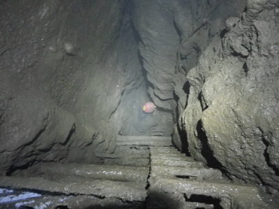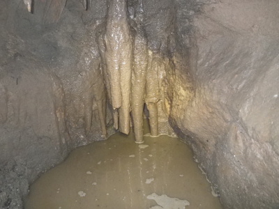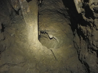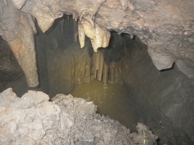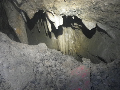 Po vyklizení části prostůrky za sintrem jsme ty ošklivé slepence sintru a bahna pošimrali palicí a cesta byla volná. Zkrátka dle hesla, co nejde silou, jde ještě větší silou. Po pár kopnutích se před námi objevila u stropu volná odtoková chodbička výšky cca 20 cm a šířky 50 cm s hlinitým dnem. Bylo vidět tak 2 m a slyšet skap do blízského jezírka.