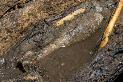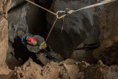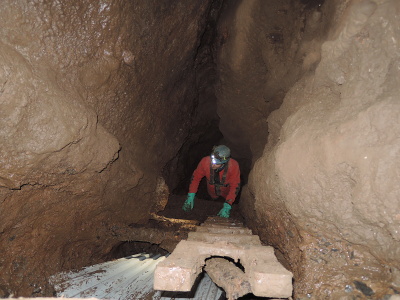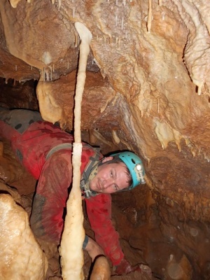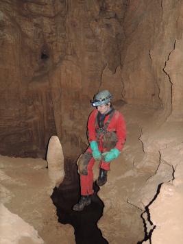 V meandru byla podle termokamery vyšší teplota, nicméně za prostřílenou úžinou byla teplota jen o jeden stupeň vyšší než ve vstupní propasti, Dnem meandru přitékal chladnější průvan, který se stáčel opět do stropu nalezeného dómku. Všechny malé trativůdky podél stěn byly bez výrazných změn teploty. Zajímavostí toho místa tedy zůstává fakt, že se nachází cca 2 až 3 m od konce vykopané chodby s aktivním odtokem a přitom o této skutečnosti není ve zdejší prostoře ani památky. Dno je pokryto poměrně mladě vypadajícími jemnými hlínami s drobnými kostmi bez kamenů. Kopaná sonda hloubky 2 metry sledovala jižní stěnu, vedoucí ve směru teoretického pokračování meandru. Jedná se o stěnu pokrytou krápníkovou výzdobou, záclonami...bohužel však stěna jen pomalu ubíhá kolmo dopředu a sonda zatím neodhalila naději na rychlý postup vpřed, i když jak se říká, naděje umírá poslední. Bez průvanu je to ale vždy loterie. Cestou zpět jsme pořídili fotodokumentaci starého minometného granátu a pak šup nahoru. Cestou vzhůru se ještě stala jedna žertovná historka a to když Štěpánovi téměř od vrcholu propasti spadla dolů jeho popruhy uchycená čelovka Army Tec. Jen jsem na něj soustrastně zavolal, že to má za sebou a že už teď asi letí do křemíkového nebe, ale Štěpán trval na tom, že si z tréninkových důvodů slaní pro její zbytky. Jaké bylo naše překvapení, když mi po chvíli zespoda zavolal, že ji vidí dole svítit. A skutečně. Přežila to celkem bez úhony!! Klobouk dolů!