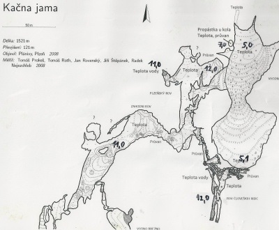 Plzeňský tým měl docela nabitý program, protože si museli v jednom dnu vystrojit i odstrojit vstupní propast (-180 m). Dále pak proměřili teploty v celém Plzeňském rovu a Rovu človeških ribic. Zatímco na povrchu panovaly teploty okolo 13°C, dole pod vstupní propastí bylo 5°C. Z propástky u kola stoupal průvan o teplotě 7°C. Dole v Južné dvoraně bylo taktéž 5°C a silný průvan proudil jako vždy do závalu pod průlezem cca 7 m pode dnem Južné dvorany. Po prosmýknutí se závalem do Rovu človeških ribic se situace výrazně mění. Ačkoliv na aktivu reky byla průměrná teplota cca 4 až 5°C, přítokovým sifonem přitékala do RČR voda o teplotě 12°C z oblasti mohutné povrchové doliny Radvanj. To otepluje zdejší chodby na stejnou teplotu 12°C. Voda odtéká do pukliny závalu zřejmě do aktivu reky za Lojzovým podorem a z tohoto důvodu jsou zdejší prostory pro nás velice pozoruhodné. V plzeňském rovu byla teplota vody v sifonu 11°C, ale samotná chodba má také 12°C. Do Plzeňského rovu směřuje pouze slabý průvan, který se v koncovém závalu nepodařilo dost dobře identifikovat. Zdejší prostory nesou známky častějšího zaplavování, ovšem proud vody není výrazný a nezpůsobuje velké přesuny materiálu. Zdá se, že zával na konci chodby je spadený dost na těsno. Taktéž se zde neobjevuje povodní nesená dřevní hmota nebo odpadky. Jediné, co zde bylo kdy nalezeno z říše lidí byla kostička lega, Tato skutečnost je nejspíš důvod proč se v RČR tak líbí macarátům. V chodbě Zahodni rov, která začíná u Vstupní propasti byly pozorovány také vysoké teploty 11°C. Neznámé odbočky zde však neskýtají nadějné pokračování. Z pozorovaných skutečností lze konstatovat, že Propástka u kola skýtá určitou naději na obejití koncového závalu Plzeňského rovu a proto toto místo v nejbližší době podrobíme důkladnému pozorování. Ze zaměření propástky vyplývá, že by stačilo v hlavní prostoře udělat zhruba 2 m hlubokou sondu, která se napojí do vrcholu spodní propástky, ze které by se tak dal pohodlně vytahovat materiál rovnou do hlavní prostory a postup dolů do kameny zasypané propástky by byl velice efektivní. Z celkové mapy Kačne jamy je patrné, že toto místo je již prakticky poslední nadějí, jak proniknout do chodby propojující Plzeňský rov s Peščení rovem na jejíž spojnici kdysi dávno, na křížení puklin s jinými chodbami, vznikla gigantická prostora, která se posléze prořítila až na povrch a dala tak vzniknout podzemnímu závalu Lojzov podor a povrchovému propadu Bukovnik. Pod ním se nachází místo aktivního odtoku Reky, která zde mizí a objevuje se až po 6 km v jeskyni Jama 1 v Kanjaducah. Pátrání po aktivním toku je z povrchu komplikováno faktem, že se za Kačnou jamou terén prudce zvedá do podoby kopců, které sice mají tu a tam nějakou propast hlubokou víc jak 100 m, ale dno je většinou zasucené závaly a nachází se teprve na výškové úrovni vchodu do Kačne jamy.