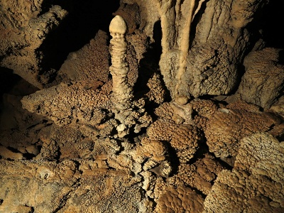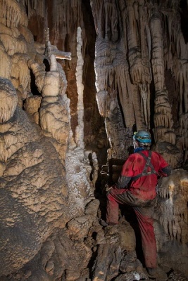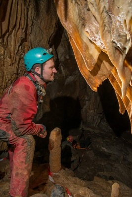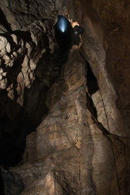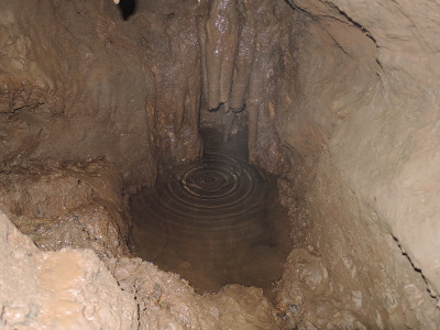 I do této jeskyně jsme vyrazili s termokamerou, která bezpečně poznala odbočku do nižšího patra dle výrazně vyšší teploty. Vstupní partie byly oproti venkovní teplotě 13°C výrazně chladnější – cca 6°C. O to zajímavější však bylo, že v klesající vstupní chodbě dochází za užším průstupem k výraznému navýšení teploty. Termokamera jako zdroj nejteplejšího průvanu určila samotný konec chodby s malým jezírkem a sintrovými náteky.