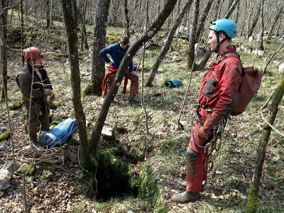 V sobotu celý moravský tým vyrazil do propasti Velika Šprinčnica. Jedná se o jeskyni, která (píchá) s Rekou. Neboli, když nastupuje na aktivu Reky povodeň, odchází touto jeskyní silný průvan z podzemí. Jeskyně se nachází na kopci nad lomem na řezaný vápenec.