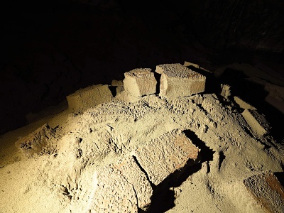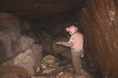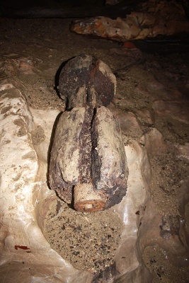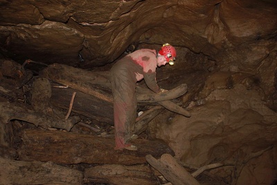 Na zpáteční cestě přes Labirint jsme nejdříve našli pravěkou dřevěnou bombu. Bombu odborně zneškodnil přivolaný pyrotechnik a tak jsme mohli jít navštívit Lojzov podor. Maďari bohužel lezení mezi bloky závalu vzdali z důvodu bezpečnosti a tak jsme alespoň pod závalem zkusili zabádat v odtokových chodbách, kam vtahuje silný proud klády, plastové nádoby a kanystry všeho druhu. Nejspodnější chodba, která je nejvíce vpravo pod kompaktním stropem je na začátku komplet zanesená jemným listím a větvičkama. Zato chodba ležící nepatrně vlevo a o 3 m výš byla jen decentně zatarasená pár kládama a za nimi jsme již pronikli do cca 20 m dlouhého pokračování s docela intenzivním průvanem. Byla zde možnost proniknout zpět do spodnější chodby, která zde není úplně zanesená jemným plávím, ale dle průniku Tomáše P. a Jirky Š. několik let zpátky zde narazili na zanesené pukliny. Levá strana horní chodby je tvořena stabilně opřeným závalem, který vzadu přechází v kompaktní chodbu tvořenou odskočeným blokem od stropu. Výška pokračování je cca 1,2 m a je zarvaná kládami, mezi kterými je vidět dál. Na příští akci tedy možná zorganizujeme jeden až dva dny dlouhou akci na vyklizení této chodby a její intenzivní zkoumání co do směrů průvanů, tak také možnosti dalšího průniku ve směru aktivního odtoku. To že to tudy odtéká dál je jasné, jde jen o to, aby se na určitém místě nenacházel jen zával, kterým se voda cedí. Zatím je možnost jít pod výrazně velkým horizontálním kompaktním stropem. V chodbě jsou zaseklé jen středně velké klády, které půjdou kladkostrojem vytáhnout. Snad to takto půjde i dál. Chodba byla zmapována.