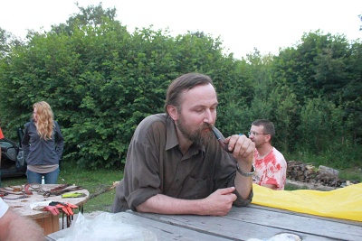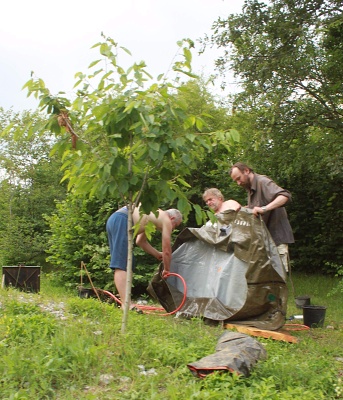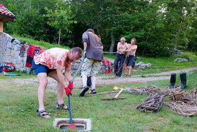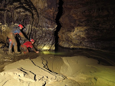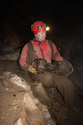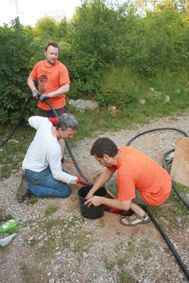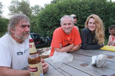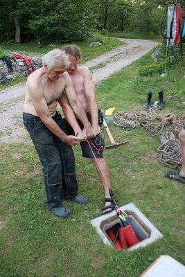 FanTomáš s Jéňou po sestupu na dno vstupní propasti zahájili kopání sondy pod koncem lana, která má za cíl dosáhnutí stropu druhé Propástky u kola. Její strop totiž tvoří zaklíněné balvany, nacházející se právě 3 m pod hlinitým dnem u konce lana. Za normálních okolností je dole ve vstupní propasti docela zima (5st.C), ale když jsme s Jéňou zapli KOPENÍ, tak nám bylo za chvilku teplo. Začali jsme zarovnávat šikmý hlinitý svah a dostali jsme se s kopáním pod úroveň dna u lana. Ve výkopu jsme dokonce našli veliký balvan, který jsme z bezpečnostních důvodů skutáleli z vrcholu suťového kuželu na dno Južné dvorany. Byl to docela slušný rachot. Ve chvíli, kdy se k nám připojil Kocour, který dával pozor na Zdeničku, jsme vyrazili s materiálem do Peščeny dvorany. Zde jsme odložili bivakovací věci a šli dále s materiálem za Ogabné jezero až do Dvorany slepé ekipe, kde jsem vše složili a otočili se směr bivak. Večer jsme se všichni potkali v počtu 13ti lidí potkali v bivaku v Peščeni dvoraně a pomohli jsme maďarům zlikvidovat jejich zásoby pálinky. Následovala kuchařská soutěž a pak už jenom klasická podzemní párty ve spacákách.