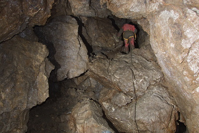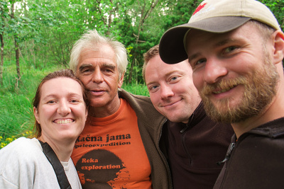 Cestou přes Logaški rov jsme zkoušeli alternativní zkratku přes propástku v Srací chodbě, ale při pouhém vystrojení propástky se zdá cesta relativně nebezpečná, protože je zde potřeba zabezpečit ještě výstupový šikmý hlinitý svah, který pokud by byl rozšlapán do kluzkého bahna, může být problémový. Pak již následovalo balení věcí a transport první várky k východu, kde nám ostatní pomohli s vytažením. Nahoře jsme potkali Anděla s Vendulkou.