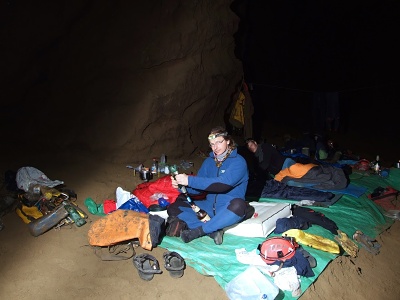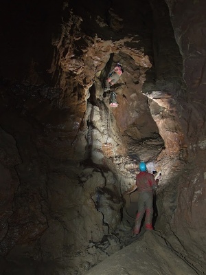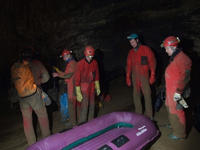V plánu bylo lezení a mapování v oblasti prvního vstupu do pater Pod dobrou vodou. Mac Giver a Vláďa byli vysláni na revizi vodního stavu v Rece na přítokovém řečišti pod svahem Artviže a my ostatní jsme zvolna sestoupili do výrazného propadu v koutu megachodby Novi svět. Jirka Š. a Pavel začli lézt výrazný kout směrem k horní galerii. Té nakonec ve výšce cca 30 m dosáhli, ale bohužel nikam nevedla. My ostatní jsme začali sestupovat do pater Pod dobrou vodou. Cestu vystrojil Franci, který má zdejší prostory z minulých let perfektně zmapovány a naším úkolem se tak stalo domapování zbytku chodem, kde byli minule zastaveni hlubokými jezery. Tentokrát jsme sebou vzali dva tescočluny.