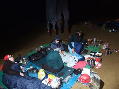 V bivaku jsme se nakonc potkali i s Kocourem a Dášou, kteří pátek strávili přestrojováním stupně Ponvice a traverzů v Logaškem rovu. Přidalo se i kotvení nad Saturnem. Zkrátka vše pro bezpečný pohyb v jeskyni zejména s těžkými batohy.