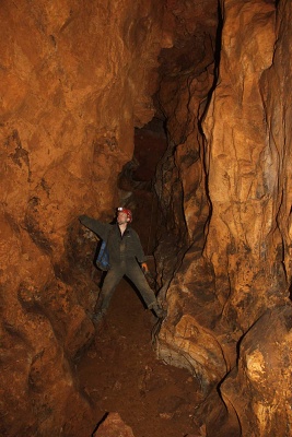 První jezero ve směru odtoku k Miranovu jezeru jsme překonali s Francim a pokračovali v mapování. Těsně za tímto jezerem se v levé stěně zvedá komín přecházející ve výšce 8 m snad do nějaké chodbičky, ale není to asi až taková peckovice, abychom se sem příště hnali. Další pokračování tvoří sintrové kaskády po nichž padá drobný tok do hloubky cca 6 m. Dolů pod poslední stupeň slezl Franci a naklikal do dista koncové záměry. Na konci Miranova jezera je snad sifon, jak ukazuje mapa. Za sifonem má navazovat přítokové jezero Okretnice, místo zvané Štacjon neboli Nástupiště či zastávka. Ano tyto prostory jsou přímo pod nádražím v Divači. Jinak Okretnica je v překladu točna, ale ta již byla na povrchu zrušena. Pod dobrou vodou jsme se přesunuli s mapováním k přítokovému jezeru, které končí pod cca 20 m hlubokou propastí, která se oblízá zprava v horní chodbě. Je to takové impozantní místo a zřejmě tu někdy mohl být za povodní i solidní vodopád. Dnes však prostory zřejmě zatápí voda odspoda a tak to nejspíš až takový hukot nebude. Ale kdo ví. Každopádně jsme to nechtěli zažít a tak jsme vyfárali nahoru do hlavní chodby a poslali jsme Helču, Ivču a Franciho na kontrolu vodních stavů. Kontrola dopadla naštěstí dobře a tak jsme ještě na zpáteční cestě zmapovali v nejvyšším dómu Nového světa okno + 8m, které před pár roky zdolali maďaři. Bohužel další pokračování je zasintrováno. Lano je však ukotveno solidně na dvou regulerních plaketách a majlonách a tak, kdo nevěří, ať tam běží.