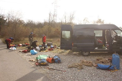 Takto nějak by se dala charakterizovat naše podzimní expedice, na kterou jsme vyrazili ve středu 16. listopadu před státním svátkem. Z ČR nás jelo celkem 10, což je vždy solidní základ pro slušnou akci. V odpoledních hodinách vyrazilo družstvo B ve složení Pavel Kubálek, Vláďa Priesol, Franci a Jirka MacGiver Cének. Ti dorazili do Divači někdy kolem jedenácté v noci. Druhé expediční vozítko týmu A tentokrát tvořila dodávka Tranzit, která vyrážela v osm večer z Brna ve složení: Dáša Dostálová, Helča Vysoká, Ivča Kosíková, Kocour, Jirka Štěpánek a moje maličkost. Díky dešti a relativně velkému nákladu jsme museli jet opatrně a tak jsme dorazili do Divači až ve čtyři ráno. Zatímco tedy někteří pracanti v tuto dobu vstávali do práce, my teprve ulehali. Naštěstí kluci z týmu B (Borci největší) ráno tiše vstali, najedli se a šli osazovat vrátek. Druhý tým byl vzbuzen někdy kolem deváté a po krátké snídani jsme šli na chystání matroše k díře. Vystrojování se ujal Jirka a Ivča s Helčou. Ostatní se věnovali spoštění materiálu. Při čekání bylo dole Jirkovi a holkám zima a tak na chvíli zapli Kopení, nicméně to bylo naposledy během této akce, bo nebyl čas. Během transportu materiálu do bivaku v Peščeni dvoraně byla naplánována drobná taškařice v podobě barvícího pokusu. Zatímco Jirka, Pavel a Helča šli strojit propast Saturn a šli pozorovat komíny do Hojkerjevy dvorany, my ostatní jsme vystrojili propast nahoře u Kalvárie a v ní jsme pak v nejnižším místě nalévali obarvenou vodu. Jak to tak bývá, chlap nechce poslechnout dobře míněné rady ženy a tak jsme jako barvící médium použili jen fialovou potravinářskou barvu, místo fluoresceinu od Helči. V kanystrech ta tmavě fialová barva vypadala docela dobře, ale když se vlila do jemné sutě na dně propasti, nezbyl po barvě ani náznak. Bůhví jeslti prošla naše voda někam dolů. Dali jsme celkem 2 kola po cca 30ti litrech. Jasné však je, že pozorovací družstvo dole nic nespatřilo. Možná to bylo způsobeno odbarvením vody, možná nenakoukli do jednoho bočního dómku s jedním komínem, nicméně pravdou je, že v Hojkerjevě dvoraně moc komínů na lezení není a téměř všechny záležitosti se podařilo prosvítit pomocí Jéňovy řezačky, kterou nám sebou půjčil, ačkoliv sám nemohl bohužel jet. Původní plán možného propojení, v případě byť jen 5ti metrů dlouhé ucpávky, se v místních podmínkách horní propasti zdá být nereálný. Práce by zabrala neúměrně dlouho času vůči dosaženému výsledku. S tím jsme se odebrali do bivaku v Peščeni dvoraně a kolmem desáté večerní jsme se všichni potkali ve spacáčkách. Během večerní párty jsme zhodnotili, že po nedávných deštích je Kačma docela pěkně zaplněná skapovou vodou včetně Logaškeho rovu. Naštěstí lokalce bivaku v Peščeni dvoraně je luxusní a ze stropu zde kápne jen výjimečně. Dle předpovědi jsme očekávali, že během následujícího dne začne na povrchu pršet a déšť bude sílit někdy z pátku na sobotu.