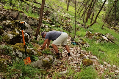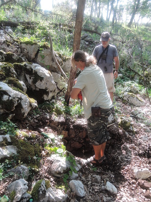 Ve středu odpoledne vyrazili do jeskyně Pepa s Radimem, aby vynesli od Reky jeden člun a nafoukli ho na Ogabno jezero. Pavel Kubálek, Martin Hejna a Pavel Kalenda zajeli odpoledne do Trebiciána poladit kabely ke kyvadlu a pak si Cingrlátko s Martinem zaběhli dolů k Rece (-330 m po žebříkách). Dole kromě velké tmy našli v řece několik Macarátů! Já, Sebo, Helča a děti jsme vyrazili na povrchový průzkum ke známé jeskyni Bajsa Melonka, kde jsme v zimě vytipovali nový vchod Dihalnik Tomik 1. Začali jsme čistit ústí nenápadné 1,5 m široké pukliny vyplněné kameny.