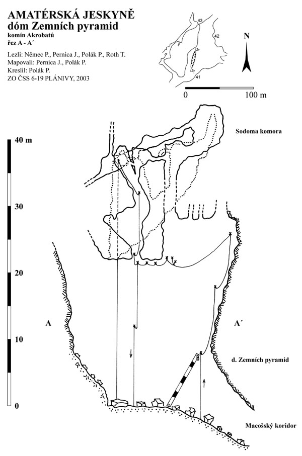 V návaznosti na předpokládaný směr toku Bílé vody, který, jak se zdá, obtéká Bludiště M. Šlechty, jsme obnovili průzkum v meandrující odbočce z Macošského koridoru naproti vchodu do jižní části Bludiště M. Šlechty. Snížením hladiny koncového polosifonu se nám podařilo v extrémních podmínkách proniknout cca 12 m úzkým kanálem do menší prostory s komínem. Průzkum zde doposud nebyl ukončen. Dále jsme dokončili průzkum a odstrojili komín Akrobatů v dómu Zemních pyramid, o kterém bylo již krátce pojednáno ve sborníku Speleofórum 2001. Zde se v nejvyšší části komína, ve výšce 40 m, podařilo objevit horizontální patro délky 30 m. Nejprve jsme pronikli úzkou chodbičkou do paralelní šachty, která vyústila ve stropu dómu Zemních pyramid. Po vystrojení traverzu bylo dosaženo malého výklenku v protější stěně šachty, avšak bez možnosti dalšího pokračování. Po odhrnutí hlinitých sedimentů ve vstupní chodbičce jsme úzkým kanálem pronikli do další paralelní šachty, také vedoucí zpět do dómu Zemních pyramid. Po jejím přetraverzování jsme objevili malý dómek nazvaný Sodoma komora (3x1,5x5m). Z okna v horní části dómu vede dále ssv. směrem svažující se chodba vyplněná hlinitými sedimenty, místy dómovitě se rozšiřující a po 10 m neprůlezně zakončená. Zvukovou zkouškou byla prokázána souvislost s dómem Zemních pyramid.