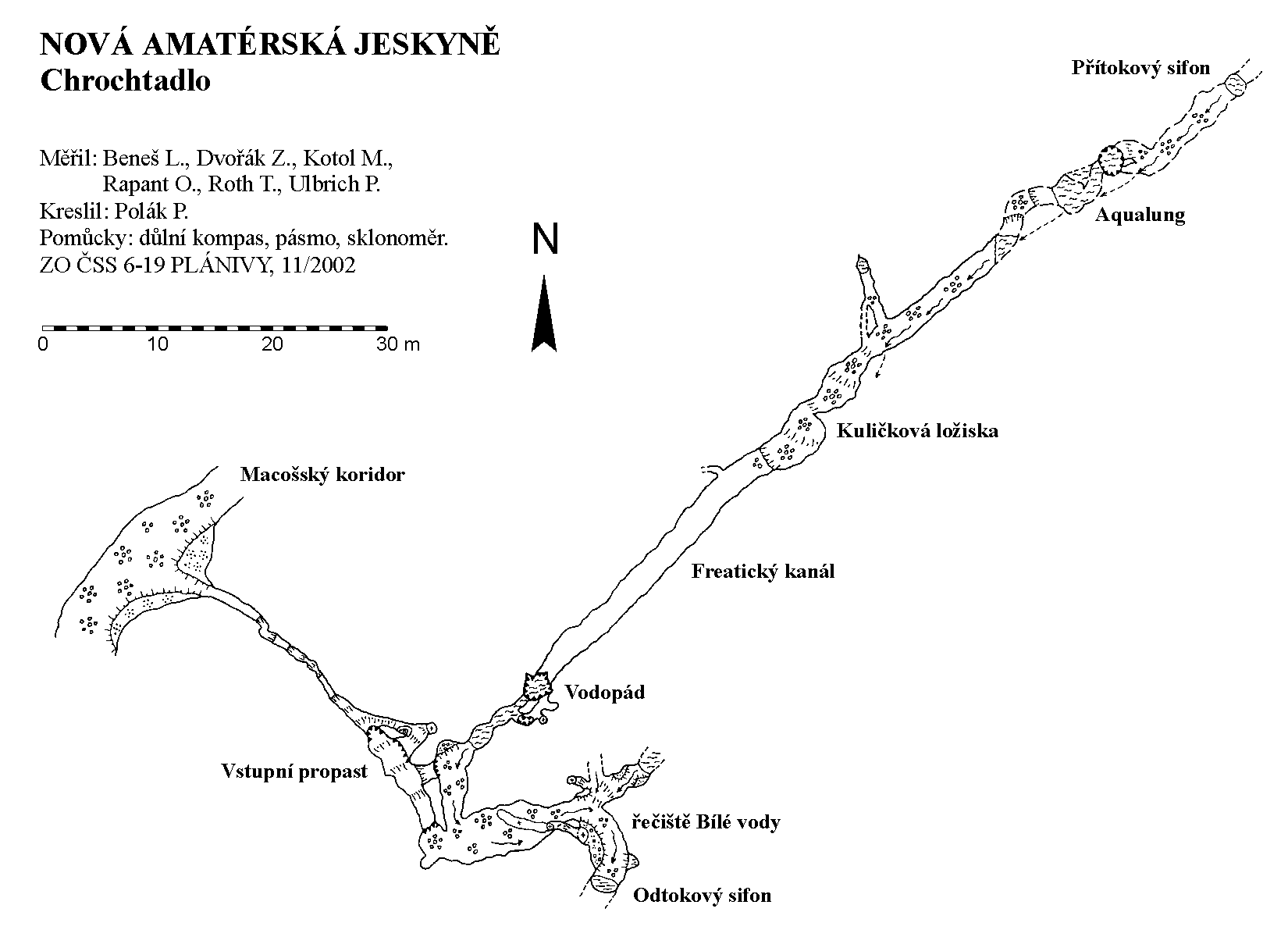V oblasti Bludiště Milana Šlechty jsme v rámci systematického průzkumu Jádra zdolali komín Nad Vodopádem do výšky 15 metrů, kde se neprůlezně uzavřel. Za extrémně nízkého vodního stavu byl pod Jádrem prolongován, po většinu roku zaplavený, systém chodeb a kanálů o délce cca 50 m s objevem výrazného komínu, který dosud nebyl prozkoumán. V jeskynním systému Piková dáma – Spirálka bylo dokončeno kabelové vedení do dómu U Přepadu pro chystaný čerpací pokus Belgického sifonu, který se díky vysokým vodním stavům nepodařilo uskutečnit. Rovněž byl zaměřen nivelační pořad mezi vchody Pikové dámy a jeskyně Trativodné v areálu Staré Rasovny. V jeskyni 13C proběhl ve spolupráci se skupinou Speleoaquanaut potápěčský průzkum přítokového sifonu do vzdálenosti 50 m. V jeskyni Panský klínek pokračovaly práce na hloubení sondy v zadních partiích. V hloubce 7 m bylo dosaženo dna a práce byly ukončeny. V jeskyni Plánivy bylo provedeno přestrojování vstupních partií. Během loňského roku došlo k zásadní reorganizaci obsahu našich internetových stránek díky zprovoznění vlastní domény www.planivy.cz. Členové naší skupiny uspořádali expedici do Maďarska do pohoří Bükk, kde sestoupili do nejhlubší maďarské propasti István Lápa Barlang a Fekete Žomboj. Rovněž jsme se zúčastnili akce Kóty 1000 – speleoprojektu Kanin 2002. Naši členové se také aktivně podíleli na činnosti SZS. |