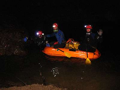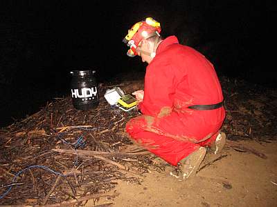Naštěstí i s tímto limitem se Honza vydal za sifon na cca 4,5 hodininy, během kterých měl udělat buď objevný postup a nebo se bezpečně vrátit. Jak slíbil, tak i udělal. V 18.hodin se vrátil s dalšími obevenými stovkami metrů. Problém byl v tom, že se po vynoření za 400m dlouhým druhým sifonem