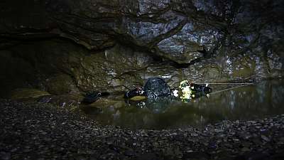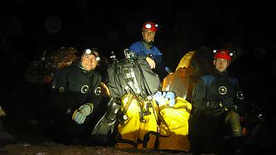 Po návratu jsme rozhodli, že použijeme na další průzkum dostupnou sestavu 4x10l na 250 bar. Bohužel oproti původnímu plánu, který počítal v této situaci s využitím rebreathru, jsme museli zvolit alespoň tuto variantu. Vsadili jsme na to, že Honza jakožto zkušený sólo potápěč dokáže za sifonem projít co půjde a vrátí se zpět. Naneštěstí v naplánované době na ponor, jako snad pokaždé, hrozili deště a další měli přijít v noci po návratu ze sifonu. Honza, Jindra a Bradek šli do akce s tím, že se budou muset ještě po ponoru vracet až před Reku.