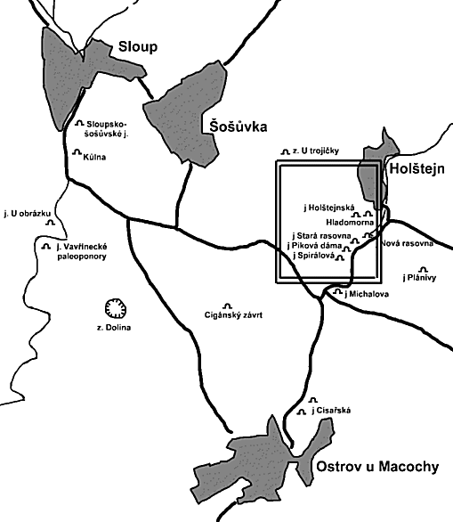 V severovýchodní části Moravského krasu, v oblasti styku vápenců a nekrasových hornin spodního karbonu - kulmu, se nachází u obce Holštejn řada propadání povrchových vod do podzemí (viz obr.1).